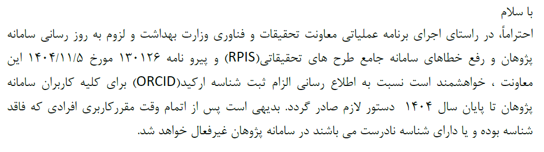جهت مشاهده فایل لزوم ثبت کد ارکید در سامانه پژوهان اینجا را کلیک فرمایید.
